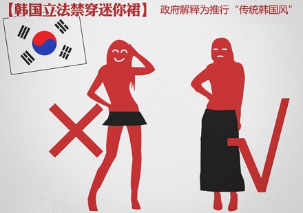 2014年3月22日,韩国「过度曝光法令」正式施行,规定女性不能穿着过于短小的迷你裙,一旦被认定在公共场合曝光的话,将会被处以高达5万韩元(约合280元人民币)的罚款!【小编:法国规定,女人可以穿裤子】
